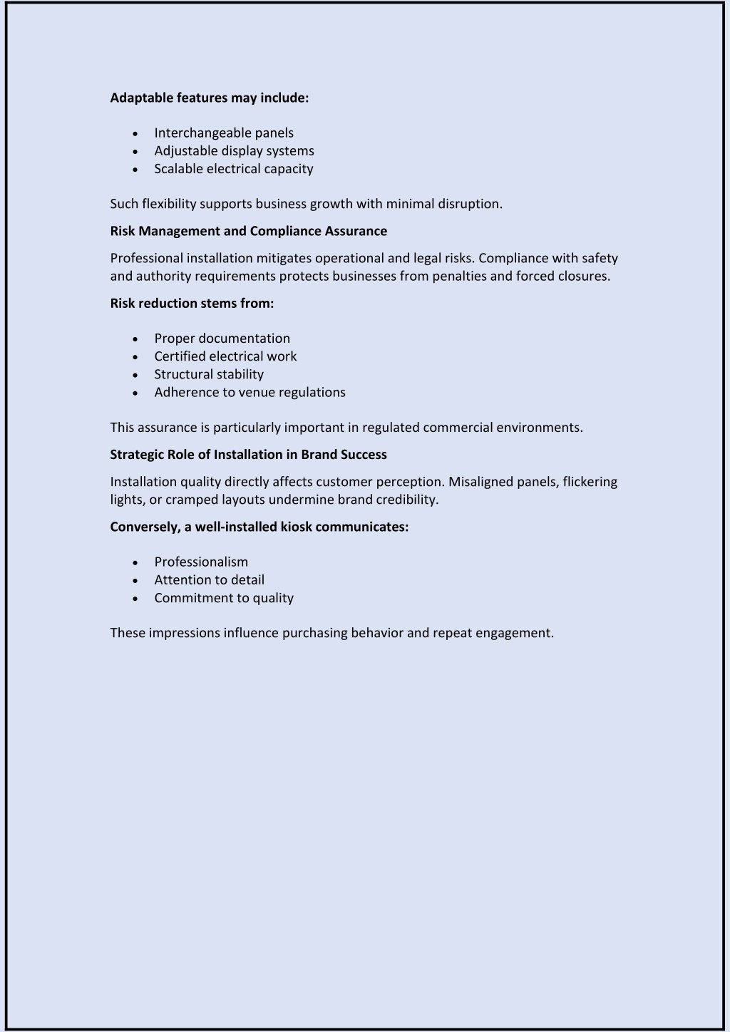 Adaptable features may include: Interchangeable panels Adjustable display systems Scalable electrical capacity Such flexibility supports business growth with minimal disruption. Risk Management and Compliance Assurance Professional installation mitigates operational and legal risks. Compliance with safety and authority requirements protects businesses from penalties and forced closures. Risk reduction stems from: Proper documentation Certified electrical work Structural stability Adherence to venue regulations This assurance is particularly important in regulated commercial environments. Strategic Role of Installation in Brand Success Installation quality directly affects customer perception. Misaligned panels, flickering lights, or cramped layouts undermine brand credibility. Conversely, a well-installed kiosk communicates: Professionalism Attention to detail Commitment to quality These impressions influence purchasing behavior and repeat engagement.