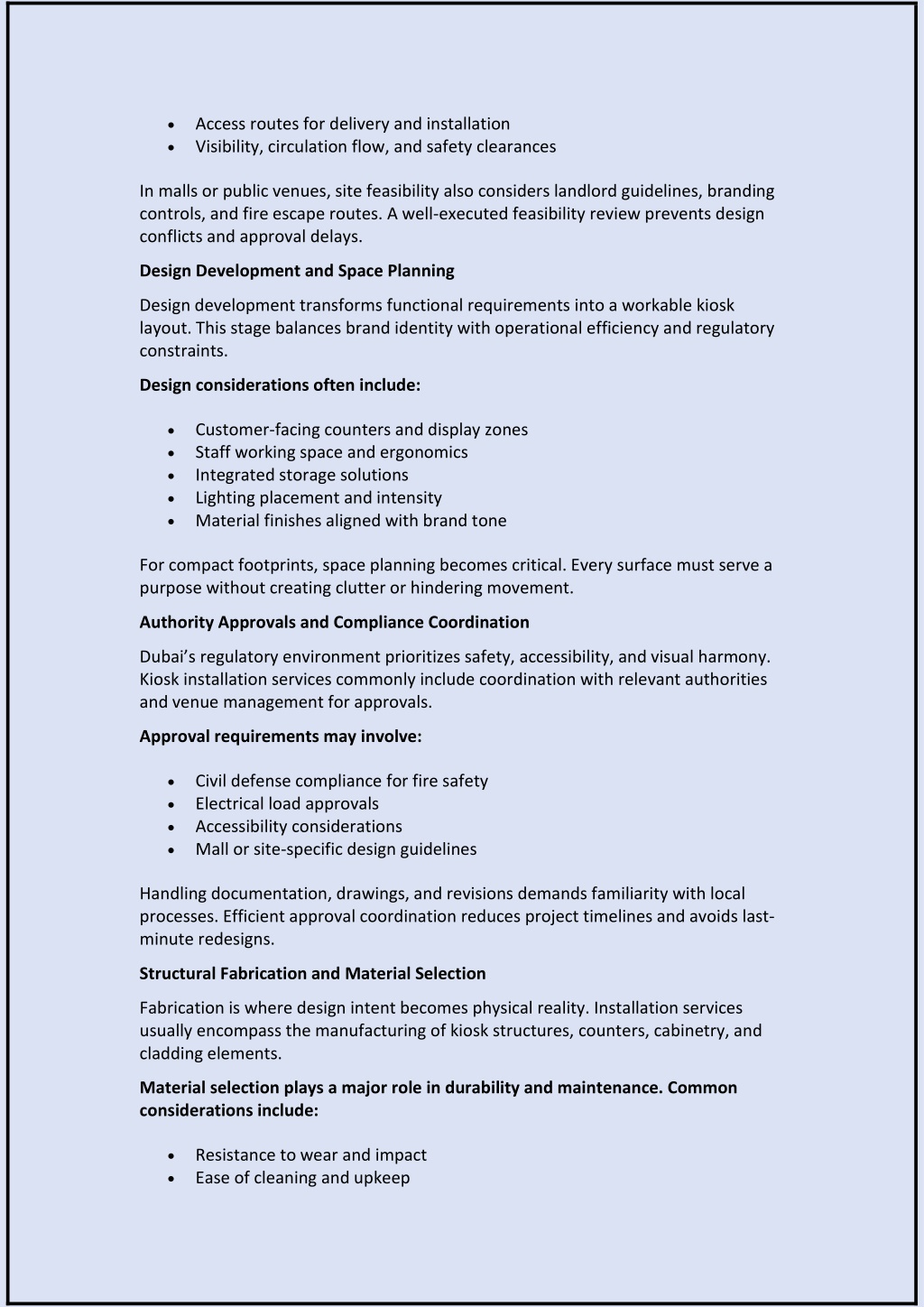 Access routes for delivery and installation Visibility, circulation flow, and safety clearances In malls or public venues, site feasibility also considers landlord guidelines, branding controls, and fire escape routes. A well-executed feasibility review prevents design conflicts and approval delays. Design Development and Space Planning Design development transforms functional requirements into a workable kiosk layout. This stage balances brand identity with operational efficiency and regulatory constraints. Design considerations often include: Customer-facing counters and display zones Staff working space and ergonomics Integrated storage solutions Lighting placement and intensity Material finishes aligned with brand tone For compact footprints, space planning becomes critical. Every surface must serve a purpose without creating clutter or hindering movement. Authority Approvals and Compliance Coordination Dubai’s regulatory environment prioritizes safety, accessibility, and visual harmony. Kiosk installation services commonly include coordination with relevant authorities and venue management for approvals. Approval requirements may involve: Civil defense compliance for fire safety Electrical load approvals Accessibility considerations Mall or site-specific design guidelines Handling documentation, drawings, and revisions demands familiarity with local processes. Efficient approval coordination reduces project timelines and avoids last- minute redesigns. Structural Fabrication and Material Selection Fabrication is where design intent becomes physical reality. Installation services usually encompass the manufacturing of kiosk structures, counters, cabinetry, and cladding elements. Material selection plays a major role in durability and maintenance. Common considerations include: Resistance to wear and impact Ease of cleaning and upkeep