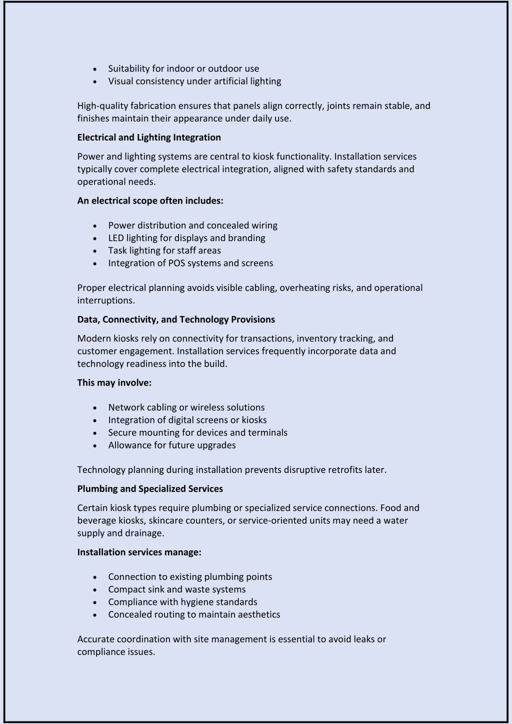 Suitability for indoor or outdoor use Visual consistency under artificial lighting High-quality fabrication ensures that panels align correctly, joints remain stable, and finishes maintain their appearance under daily use. Electrical and Lighting Integration Power and lighting systems are central to kiosk functionality. Installation services typically cover complete electrical integration, aligned with safety standards and operational needs. An electrical scope often includes: Power distribution and concealed wiring LED lighting for displays and branding Task lighting for staff areas Integration of POS systems and screens Proper electrical planning avoids visible cabling, overheating risks, and operational interruptions. Data, Connectivity, and Technology Provisions Modern kiosks rely on connectivity for transactions, inventory tracking, and customer engagement. Installation services frequently incorporate data and technology readiness into the build. This may involve: Network cabling or wireless solutions Integration of digital screens or kiosks Secure mounting for devices and terminals Allowance for future upgrades Technology planning during installation prevents disruptive retrofits later. Plumbing and Specialized Services Certain kiosk types require plumbing or specialized service connections. Food and beverage kiosks, skincare counters, or service-oriented units may need a water supply and drainage. Installation services manage: Connection to existing plumbing points Compact sink and waste systems Compliance with hygiene standards Concealed routing to maintain aesthetics Accurate coordination with site management is essential to avoid leaks or compliance issues.