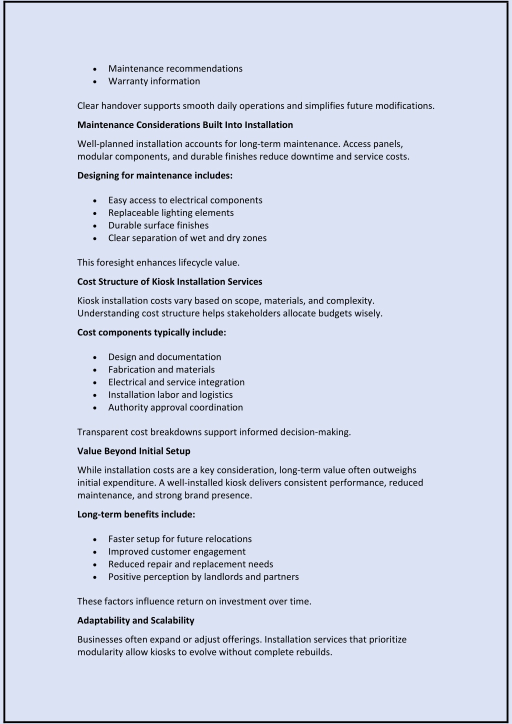 Maintenance recommendations Warranty information Clear handover supports smooth daily operations and simplifies future modifications. Maintenance Considerations Built Into Installation Well-planned installation accounts for long-term maintenance. Access panels, modular components, and durable finishes reduce downtime and service costs. Designing for maintenance includes: Easy access to electrical components Replaceable lighting elements Durable surface finishes Clear separation of wet and dry zones This foresight enhances lifecycle value. Cost Structure of Kiosk Installation Services Kiosk installation costs vary based on scope, materials, and complexity. Understanding cost structure helps stakeholders allocate budgets wisely. Cost components typically include: Design and documentation Fabrication and materials Electrical and service integration Installation labor and logistics Authority approval coordination Transparent cost breakdowns support informed decision-making. Value Beyond Initial Setup While installation costs are a key consideration, long-term value often outweighs initial expenditure. A well-installed kiosk delivers consistent performance, reduced maintenance, and strong brand presence. Long-term benefits include: Faster setup for future relocations Improved customer engagement Reduced repair and replacement needs Positive perception by landlords and partners These factors influence return on investment over time. Adaptability and Scalability Businesses often expand or adjust offerings. Installation services that prioritize modularity allow kiosks to evolve without complete rebuilds.