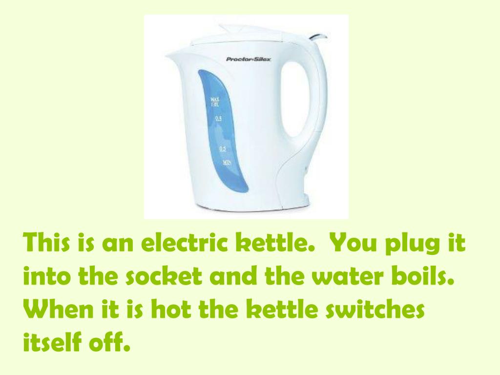 This is an electric kettle. You plug it into the socket and the water boils. When it is hot the kettle switches itself off.
