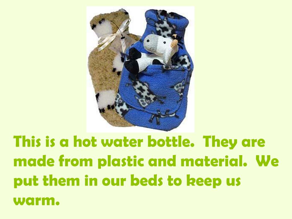 This is a hot water bottle. They are made from plastic and material. We put them in our beds to keep us warm.