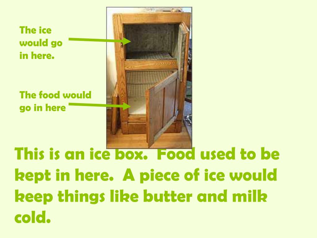 The ice would go in here. This is an ice box. Food used to be kept in here. A piece of ice would keep things like butter and milk cold. The food would go in here