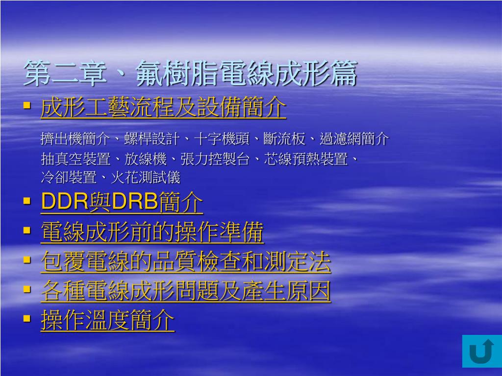 第二章、氟樹脂電線成形篇 • 成形工藝流程及設備簡介 擠出機簡介、螺桿設計、十字機頭、斷流板、過濾網簡介 抽真空裝置、放線機、張力控製台、芯線預熱裝置、 冷卻裝置、火花測試儀 • DDR與DRB簡介 • 電線成形前的操作準備 • 包覆電線的品質檢查和測定法 • 各種電線成形問題及產生原因 • 操作溫度簡介