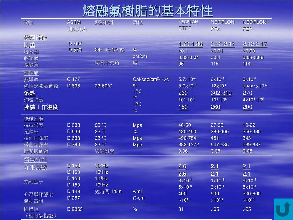 第一章、基本簡介篇 • 氟樹脂發展史 • PFA、FEP、ETFE簡介 • 熔融氟樹脂的基本特性 • 熔融氟樹脂品號及特性 大金FEP的品種及物性 FEP不同品種的材料選擇基準 大金PFA的品種及物性 大金ETFE的品種及物性