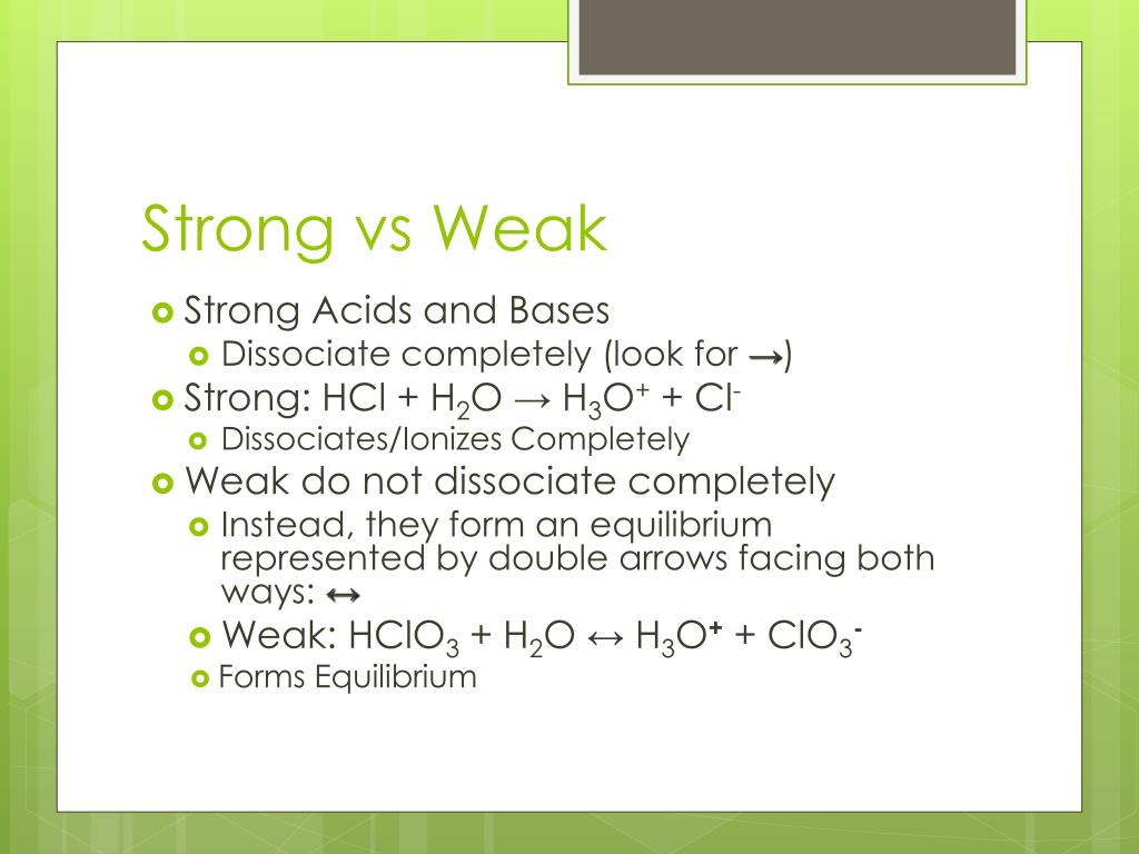 Strong vs Weak • Strong Acids and Bases • Dissociate completely (look for →) • Strong: HCl + H2O → H3O+ + Cl- • Dissociates/Ionizes Completely • Weak do not dissociate completely • Instead, they form an equilibrium represented by double arrows facing both ways: ↔ • Weak: HClO3 + H2O ↔ H3O+ and ClO3- • Forms Equilibrium