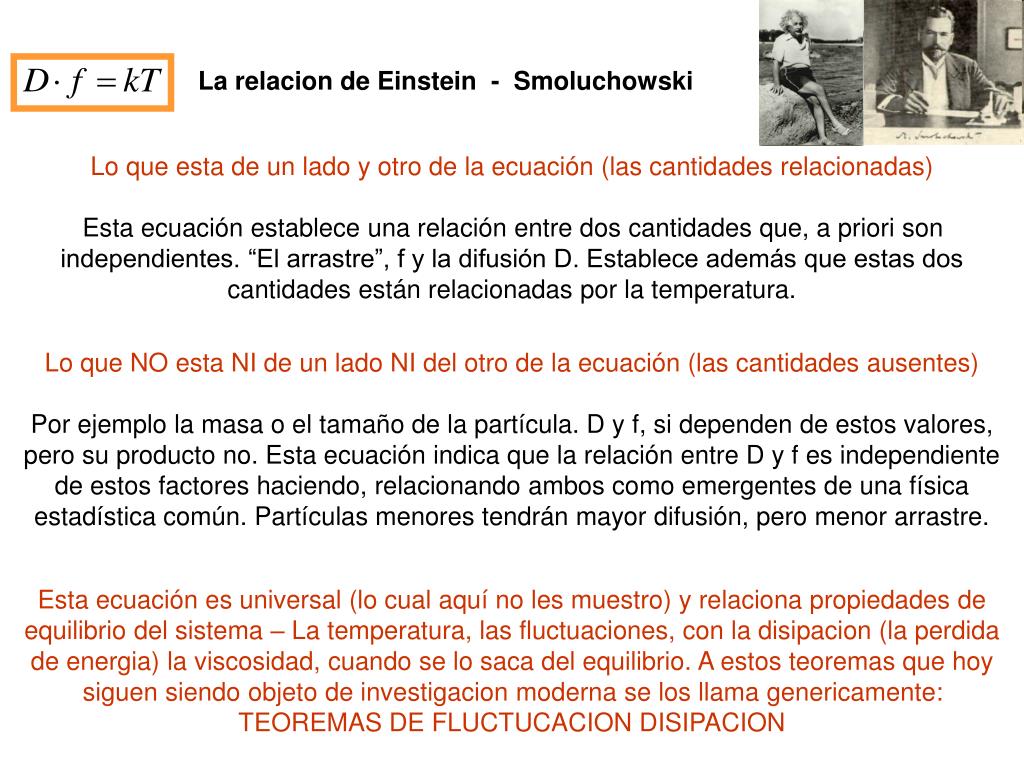 La relacion de Einstein - Smoluchowski Lo que esta de un lado y otro de la ecuación (las cantidades relacionadas) Esta ecuación establece una relación entre dos cantidades que, a priori son independientes. “El arrastre”, f y la difusión D. Establece además que estas dos cantidades están relacionadas por la temperatura. Lo que NO esta NI de un lado NI del otro de la ecuación (las cantidades ausentes) Por ejemplo la masa o el tamaño de la partícula. D y f, si dependen de estos valores, pero su producto no. Esta ecuación indica que la relación entre D y f es independiente de estos factores haciendo, relacionando ambos como emergentes de una física estadística común. Partículas menores tendrán mayor difusión, pero menor arrastre. Esta ecuación es universal (lo cual aquí no les muestro) y relaciona propiedades de equilibrio del sistema – La temperatura, las fluctuaciones, con la disipacion (la perdida de energia) la viscosidad, cuando se lo saca del equilibrio. A estos teoremas que hoy siguen siendo objeto de investigacion moderna se los llama genericamente: TEOREMAS DE FLUCTUCACION DISIPACION
