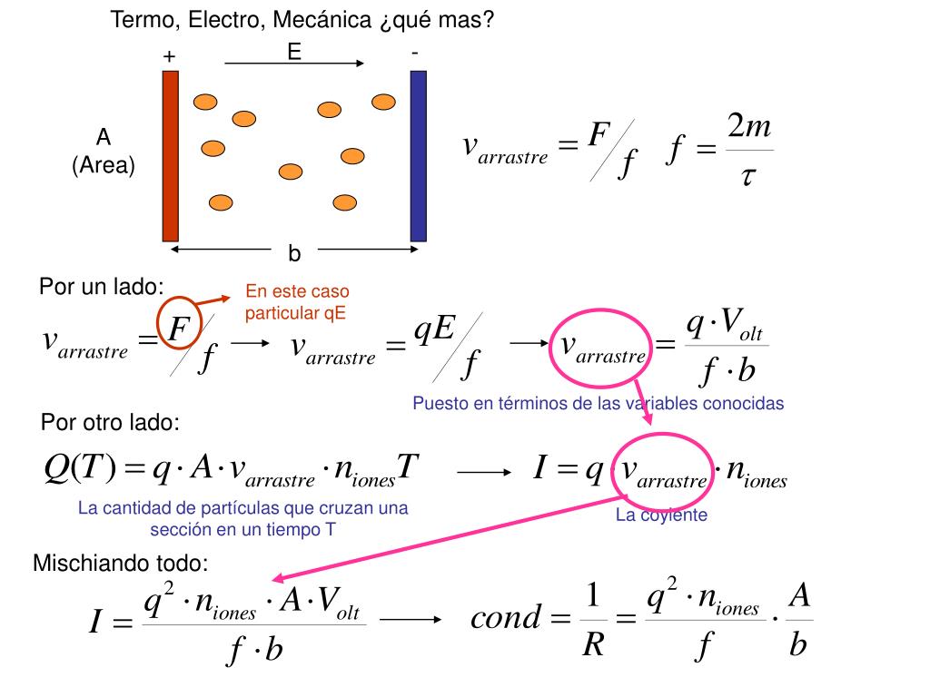 Termo, Electro, Mecánica ¿qué mas? En este caso particular qE Puesto en términos de las variables conocidas La cantidad de partículas que cruzan una sección en un tiempo T La coyiente E - + A (Area) b Por un lado: Por otro lado: Mischiando todo: