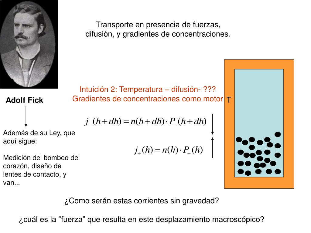 Transporte en presencia de fuerzas, difusión, y gradientes de concentraciones. Intuición 2: Temperatura – difusión- ??? Gradientes de concentraciones como motor T Adolf Fick Además de su Ley, que aquí sigue: Medición del bombeo del corazón, diseño de lentes de contacto, y van... ¿Como serán estas corrientes sin gravedad? ¿cuál es la “fuerza” que resulta en este desplazamiento macroscópico?