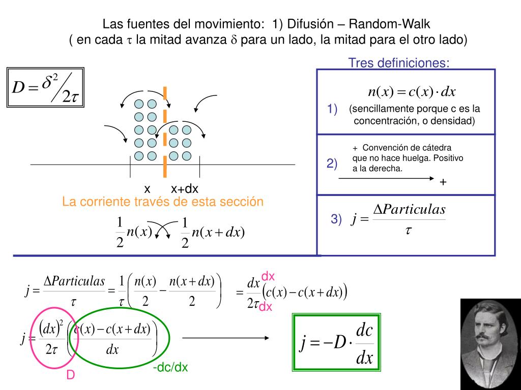 1) (sencillamente porque c es la concentración, o densidad) + Convención de cátedra que no hace huelga. Positivo a la derecha. 2) + 3) dx dx -dc/dx D Las fuentes del movimiento: 1) Difusión – Random-Walk ( en cada la mitad avanza para un lado, la mitad para el otro lado) Tres definiciones: x x+dx La corriente través de esta sección