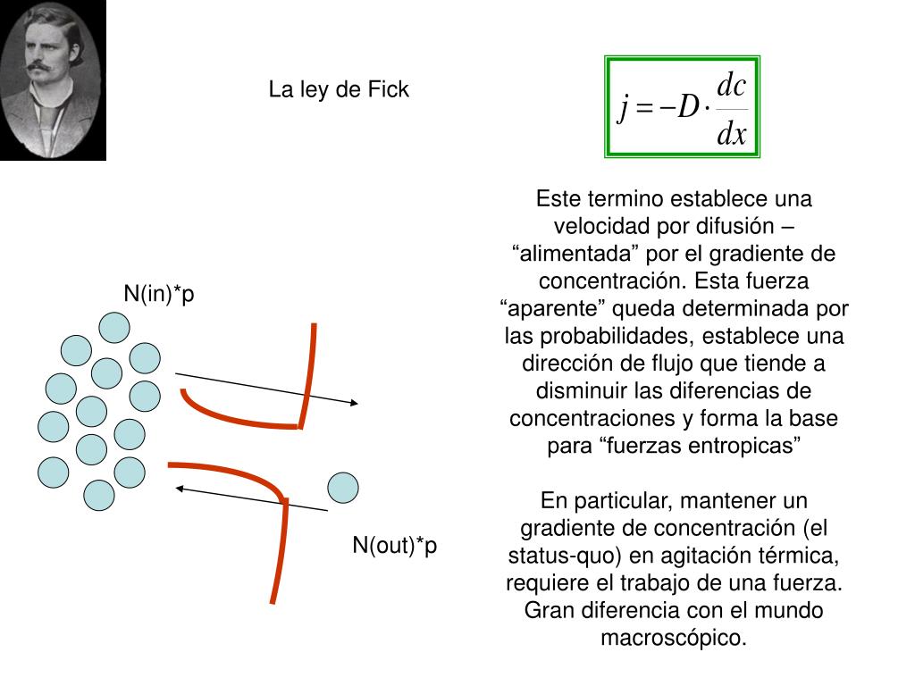 La ley de Fick Este termino establece una velocidad por difusión – “alimentada” por el gradiente de concentración. Esta fuerza “aparente” queda determinada por las probabilidades, establece una dirección de flujo que tiende a disminuir las diferencias de concentraciones y forma la base para “fuerzas entropicas” En particular, mantener un gradiente de concentración (el status-quo) en agitación térmica, requiere el trabajo de una fuerza. Gran diferencia con el mundo macroscópico. N(in)*p N(out)*p