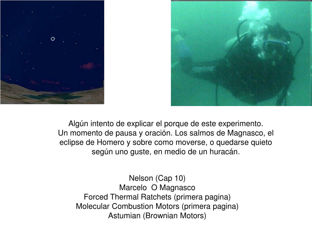 Algún intento de explicar el porque de este experimento. Un momento de pausa y oración. Los salmos de Magnasco, el eclipse de Homero y sobre como moverse, o quedarse quieto según uno guste, en medio de un huracán. Nelson (Cap 10) Marcelo O Magnasco Forced Thermal Ratchets (primera pagina) Molecular Combustion Motors (primera pagina) Astumian (Brownian Motors)