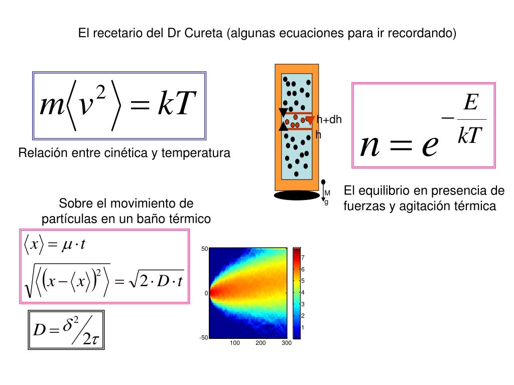 h+dh Relación entre cinética y temperatura El equilibrio en presencia de fuerzas y agitación térmica h Sobre el movimiento de partículas en un baño térmico F V- V+ La relación entre fluctuaciones térmicas y resistencia al arrastre Mg El recetario del Dr Cureta (algunas ecuaciones para ir recordando)
