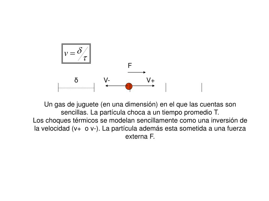 F δ V- V+ Un gas de juguete (en una dimensión) en el que las cuentas son sencillas. La partícula choca a un tiempo promedio T. Los choques térmicos se modelan sencillamente como una inversión de la velocidad (v+ o v-). La partícula además esta sometida a una fuerza externa F.