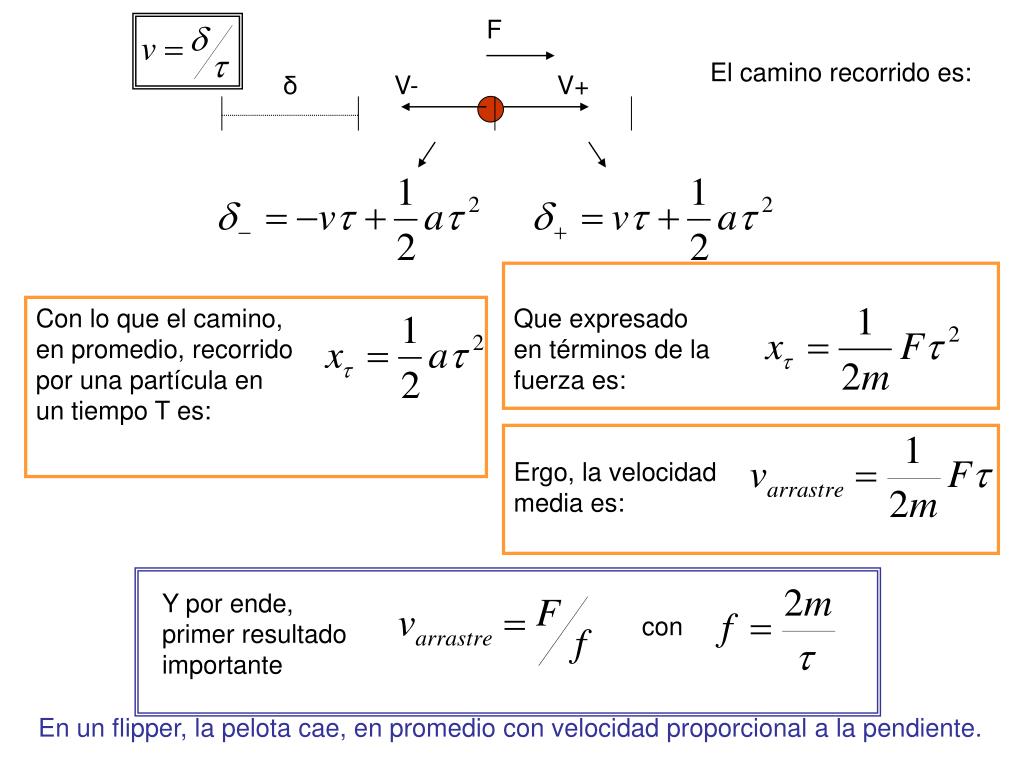Con lo que el camino, en promedio, recorrido por una partícula en un tiempo T es: Que expresado en términos de la fuerza es: Ergo, la velocidad media es: Y por ende, primer resultado importante con F El camino recorrido es: δ V- V+ En un flipper, la pelota cae, en promedio con velocidad proporcional a la pendiente.