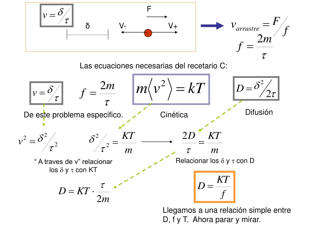 Difusión De este problema especifico. Cinética Relacionar los y con D “ A traves de v” relacionar los y con KT Llegamos a una relación simple entre D, f y T. Ahora parar y mirar. F δ V- V+ Las ecuaciones necesarias del recetario C: