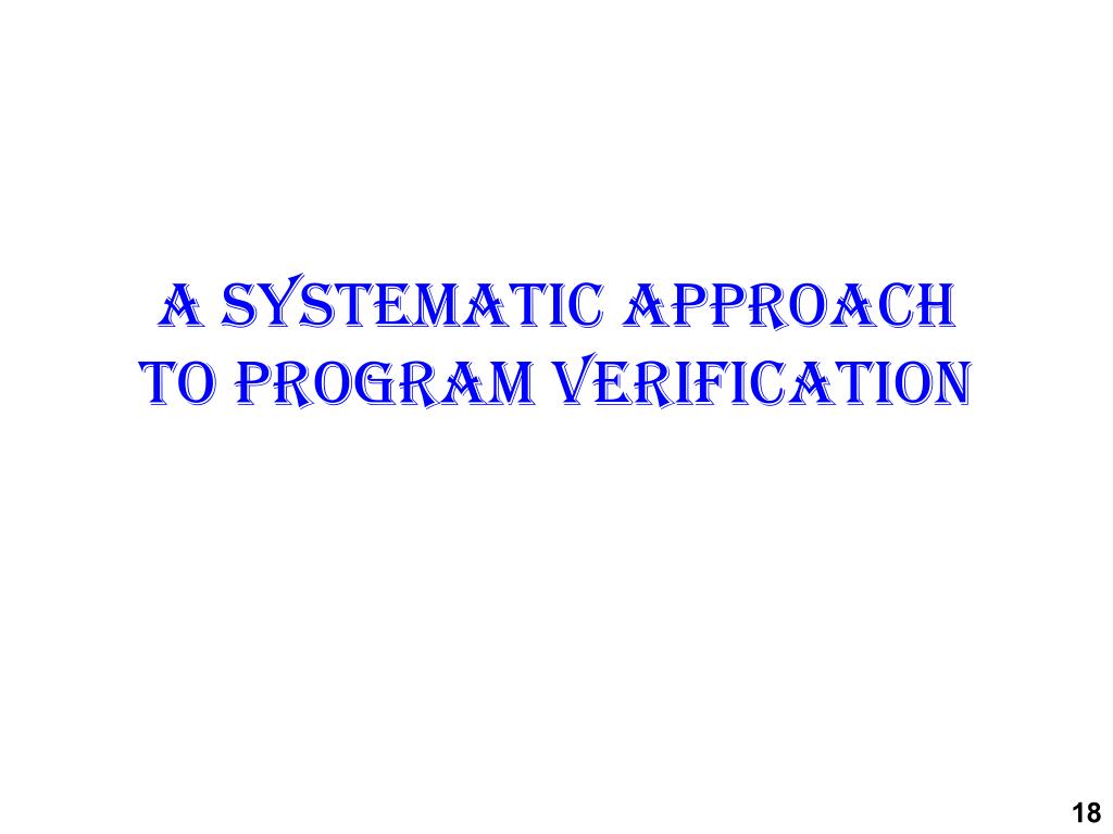 Axiomatic verification approach • Specify the required behavior • Compare the behavior with the one obtained by the operational semantics • Develop a proof system for showing that the program satisfies a requirement • Mechanically use the proof system to show correctness • What do we need in order to prove that the program does what it supposed to do?