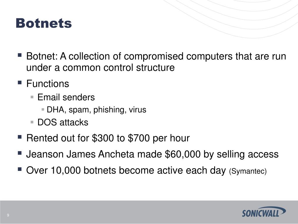Botnets • Botnet: A collection of compromised computers that are run under a common control structure • Functions • Email senders • DHA, spam, phishing, virus • DOS attacks • Rented out for $300 to $700 per hour • Jeanson James Ancheta made $60,000 by selling access • Over 10,000 botnets become active each day (Symantec)