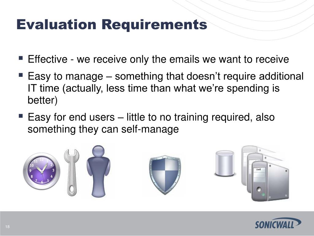 Evaluation Requirements • Effective - we receive only the emails we want to receive • Easy to manage – something that doesn’t require additional IT time (actually, less time than what we’re spending is better) • Easy for end users – little to no training required, also something they can self-manage