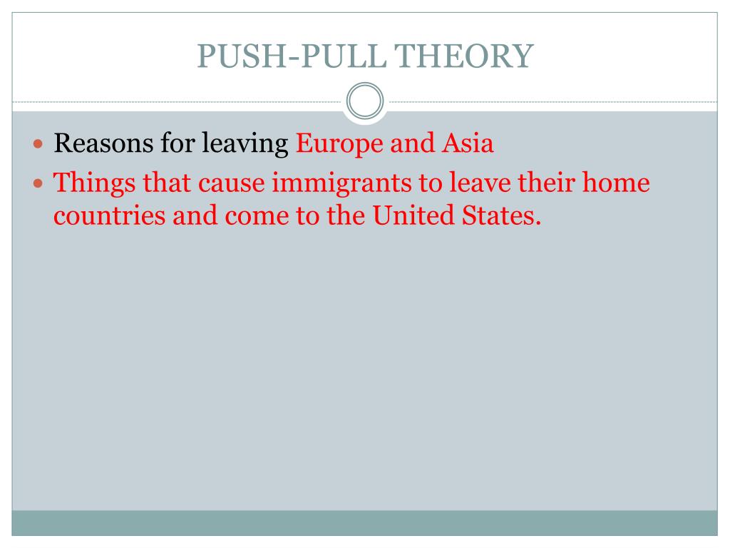 PUSH-PULL THEORY Reasons for leaving Europe and Asia Things that cause immigrants to leave their home countries and come to the United States.