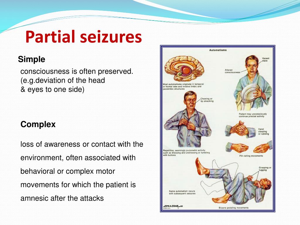 Partial seizures Simple consciousness is often preserved. (e.g.deviation of the head & eyes to one side) Complex loss of awareness or contact with the environment, often associated with behavioral or complex motor movements for which the patient is amnesic after the attacks