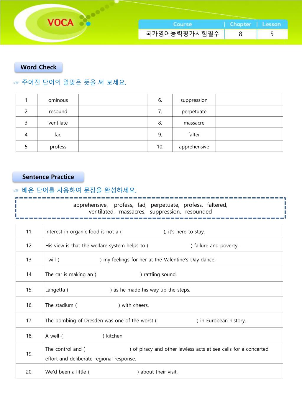 국가영어능력평가시험필수 8 5 Word Check ☞ 주어진 단어의 알맞은 뜻을 써 보세요. Sentence Practice ☞ 배운 단어를 사용하여 문장을 완성하세요. apprehensive, profess, fad, perpetuate, profess, faltered, ventilated, massacres, suppression, resounded