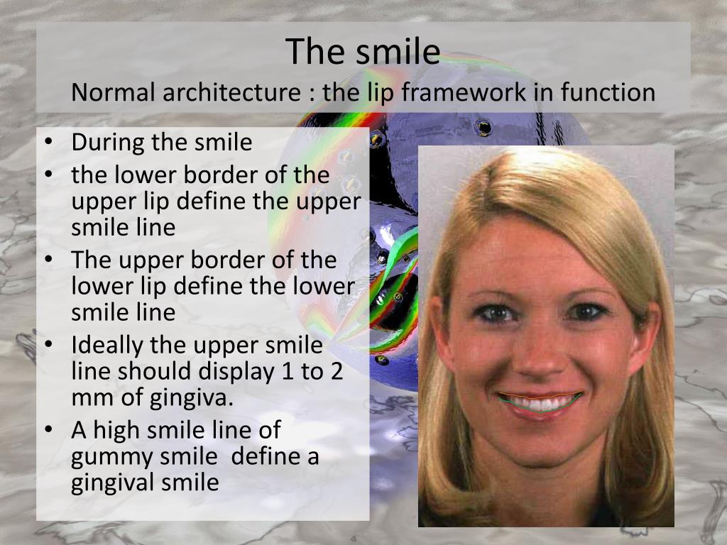 The smile Normal architecture : the lip framework at rest • At rest : • Prosthodontics guideline 2 to 4 mm are displayed at rest • The factor of influence are : • Upper lip length • The age • The race • The sex