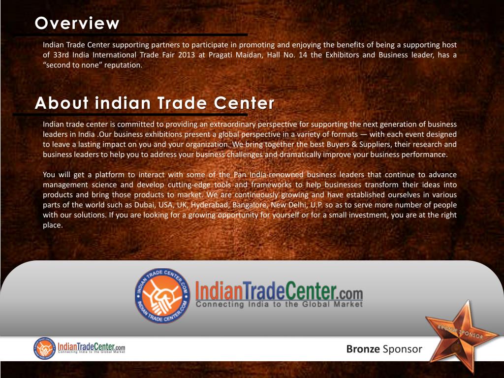Indian Trade Center supporting partners to participate in promoting and enjoying the benefits of being a supporting host of 33rd India International Trade Fair 2013 at Pragati Maidan, Hall No. 14 the Exhibitors and Business leader, has a “second to none” reputation. About indian Trade Center Overview Indian trade center is committed to providing an extraordinary perspective for supporting the next generation of business leaders in India .Our business exhibitions present a global perspective in a variety of formats — with each event designed to leave a lasting impact on you and your organization. We bring together the best Buyers & Suppliers, their research and business leaders to help you to address your business challenges and dramatically improve your business performance. You will get a platform to interact with some of the Pan India-renowned business leaders that continue to advance management science and develop cutting-edge tools and frameworks to help businesses transform their ideas into products and bring those products to market. We are continuously growing and have established ourselves in various parts of the world such as Dubai, USA, UK, Hyderabad, Bangalore, New Delhi, U.P. so as to serve more number of people with our solutions. If you are looking for a growing opportunity for yourself or for a small investment, you are at the right place. Bronze Sponsor