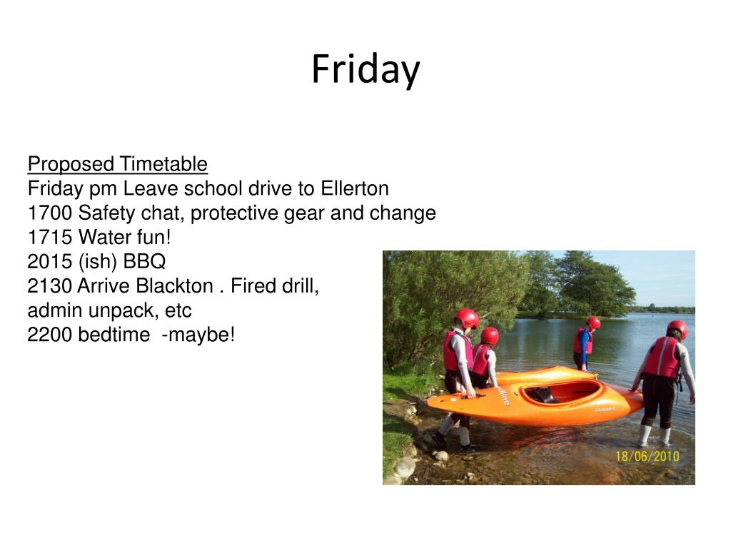 Friday Proposed Timetable Friday pm Leave school drive to Ellerton 1700 Safety chat, protective gear and change 1715 Water fun! 2015 (ish) BBQ 2130 Arrive Blackton . Fired drill, admin unpack, etc 2200 bedtime -maybe!