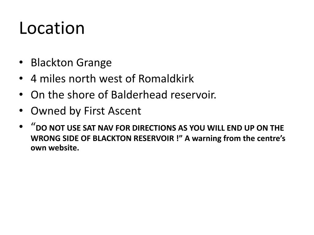 Location • Blackton Grange • 4 miles north west of Romaldkirk • On the shore of Balderhead reservoir. • Owned by First Ascent • “DO NOT USE SAT NAV FOR DIRECTIONS AS YOU WILL END UP ON THE WRONG SIDE OF BLACKTON RESERVOIR !” A warning from the centre’s own website.
