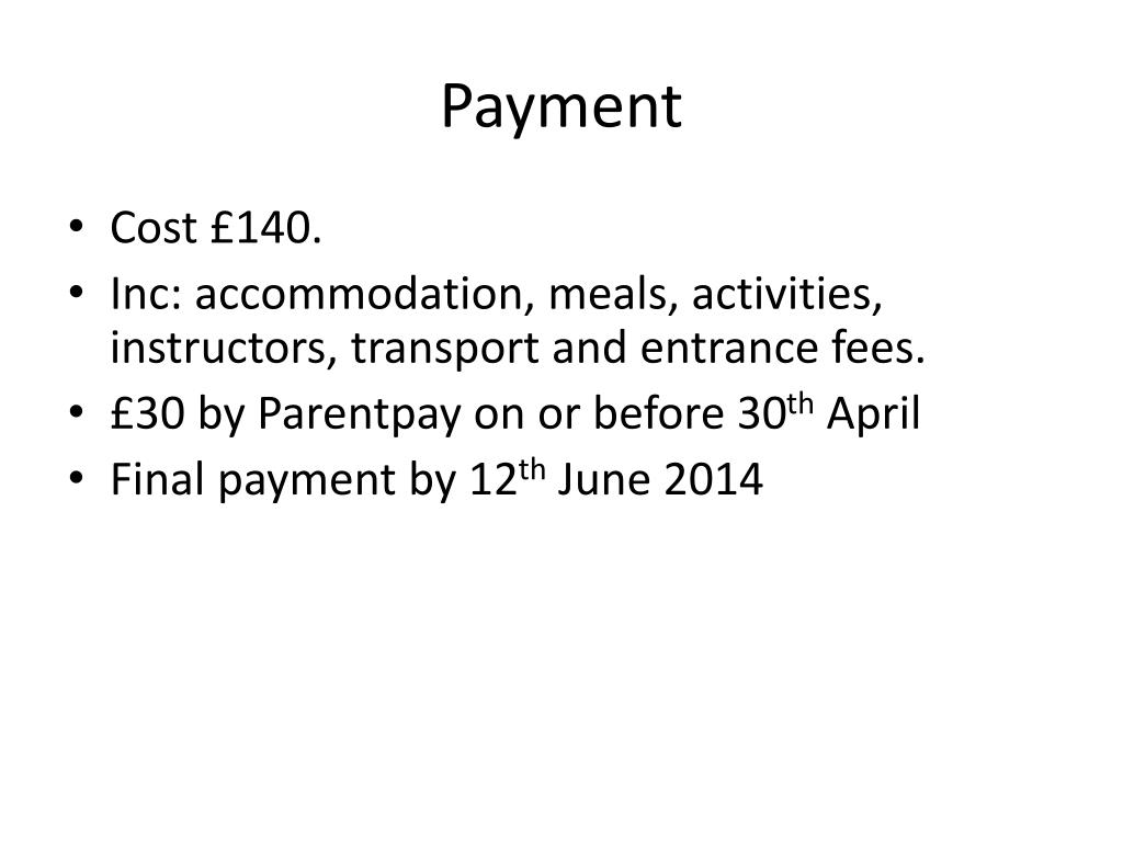 Payment • Cost £140. • Inc: accommodation, meals, activities, instructors, transport and entrance fees. • £30 by Parentpay on or before 30th April • Final payment by 12th June 2014