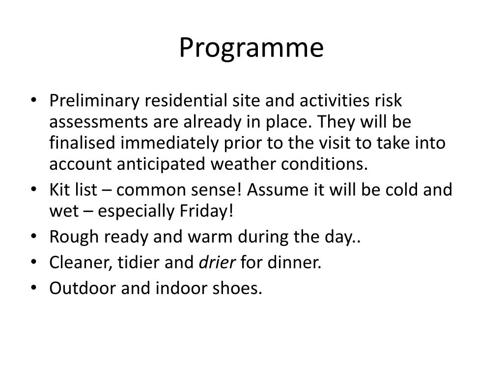 Programme • Preliminary residential site and activities risk assessments are already in place. They will be finalised immediately prior to the visit to take into account anticipated weather conditions. • Kit list – common sense! Assume it will be cold and wet – especially Friday! • Rough ready and warm during the day.. • Cleaner, tidier and drier for dinner. • Outdoor and indoor shoes.