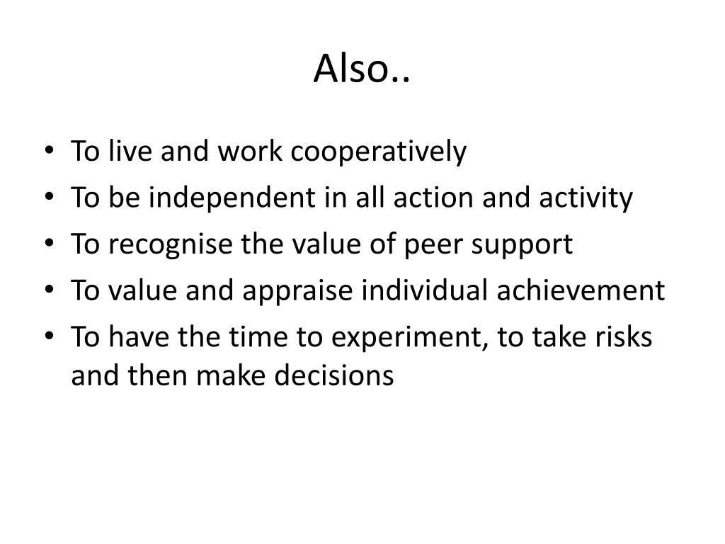 Also.. • To live and work cooperatively • To be independent in all action and activity • To recognise the value of peer support • To value and appraise individual achievement • To have the time to experiment, to take risks and then make decisions
