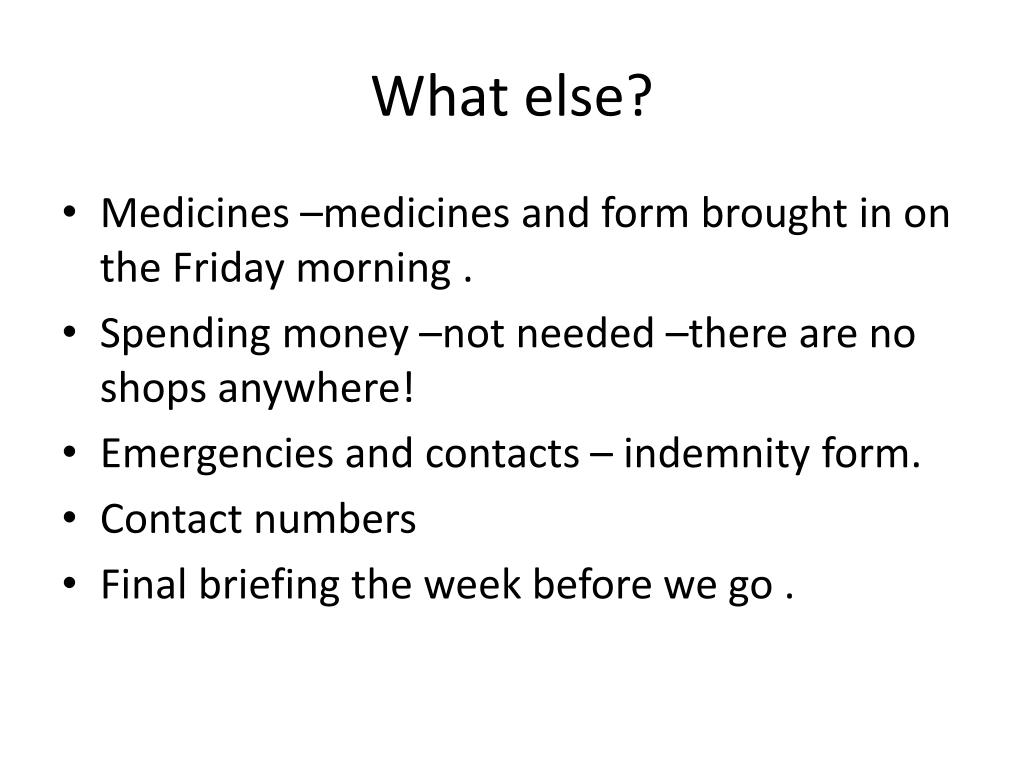 What else? • Medicines –medicines and form brought in on the Friday morning . • Spending money –not needed –there are no shops anywhere! • Emergencies and contacts – indemnity form. • Contact numbers • Final briefing the week before we go .