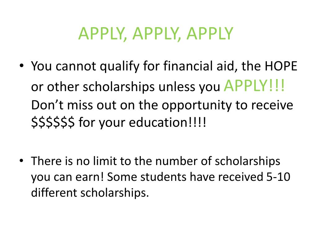 APPLY, APPLY, APPLY • You cannot qualify for financial aid, the HOPE or other scholarships unless you APPLY!!! Don’t miss out on the opportunity to receive $$$$$$ for your education!!!! • There is no limit to the number of scholarships you can earn! Some students have received 5-10 different scholarships.