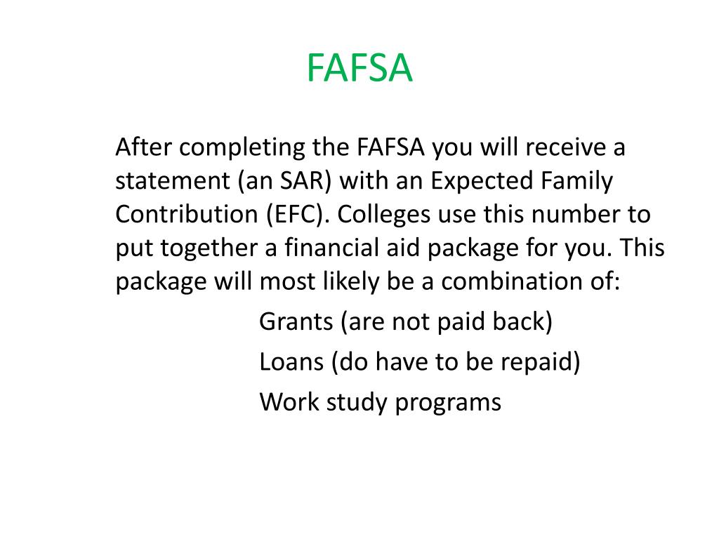 FAFSA After completing the FAFSA you will receive a statement (an SAR) with an Expected Family Contribution(EFC). Colleges use this number to put together a financial aid package for you. This package will most likely be a combination of: Grants (are not paid back) Loans (do have to be repaid) Work study programs