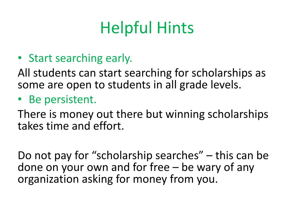 Helpful Hints • Start searching early. All students can start searching for scholarships as some are open to students in all grade levels. • Be persistent. There is money out there but winning scholarships takes time and effort. Do not pay for “scholarship searches” – this can be done on your own and for free – be wary of any organization asking for money from you.