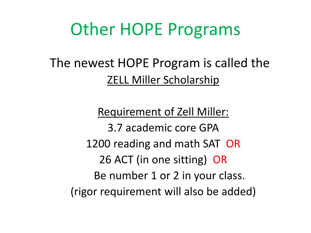 Other HOPE Programs The newest HOPE Program is called the ZELL Miller Scholarship Requirement of Zell Miller: 3.7 academic core GPA 1200 reading and math SAT OR 26 ACT (in one sitting) OR Be number 1 or 2 in your class. (rigor requirement will also be added)