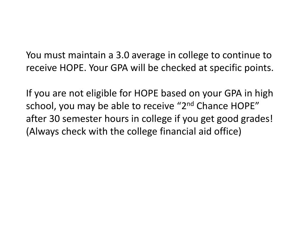 You must maintain a 3.0 average in college to continue to receive HOPE. Your GPA will be checked at specific points.If you are not eligible for HOPE based on your GPA in high school, you may be able to receive “2nd Chance HOPE” after 30 semester hours in college if you get good grades! (Always check with the college financial aid office)