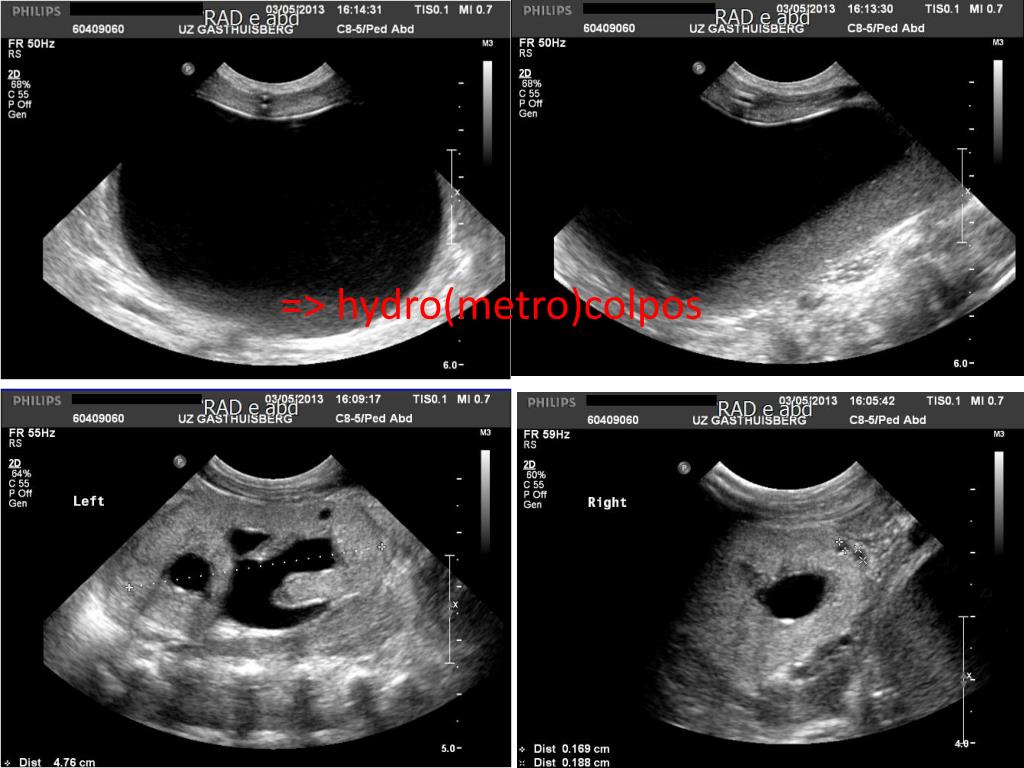 Verder verloop • Bilanurogenitale connectie: • MCUG en colpografie • Cystoscopie • MRI • Verschillende echografische herevaluaties • Recidiverende infecties van de massa: • Koorts 38°, huilen, oncomfortabel • Echo: reflecties in hydrocolpos • Urine: clean catch +++ vs gesondeerd – • Hemocultuur: +++ werkhypothese: urogenitale sinus/vaginale atresie met fistel