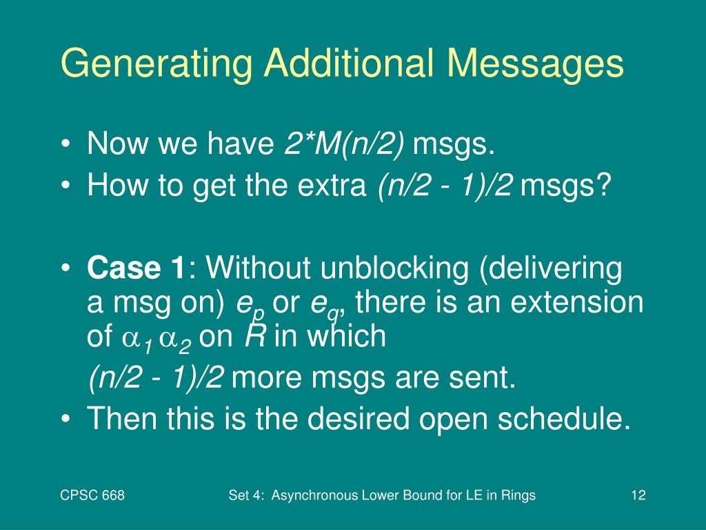 Generating Additional Messages • Now we have 2*M(n/2) msgs. • How to get the extra (n/2 - 1)/2 msgs? • Case 1: Without unblocking (delivering a msg on) ep or eq, there is an extension of 1 2 on R in which (n/2 - 1)/2 more msgs are sent. • Then this is the desired open schedule. Set 4: Asynchronous Lower Bound for LE in Rings