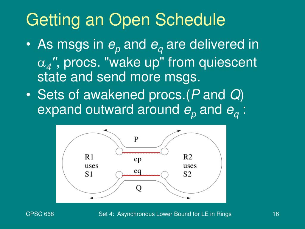 Getting an Open Schedule • As msgs in ep and eq are delivered in 4'', procs. "wake up" from quiescent state and send more msgs. • Sets of awakened procs.(P and Q) expand outward around ep and eq : Set 4: Asynchronous Lower Bound for LE in Rings