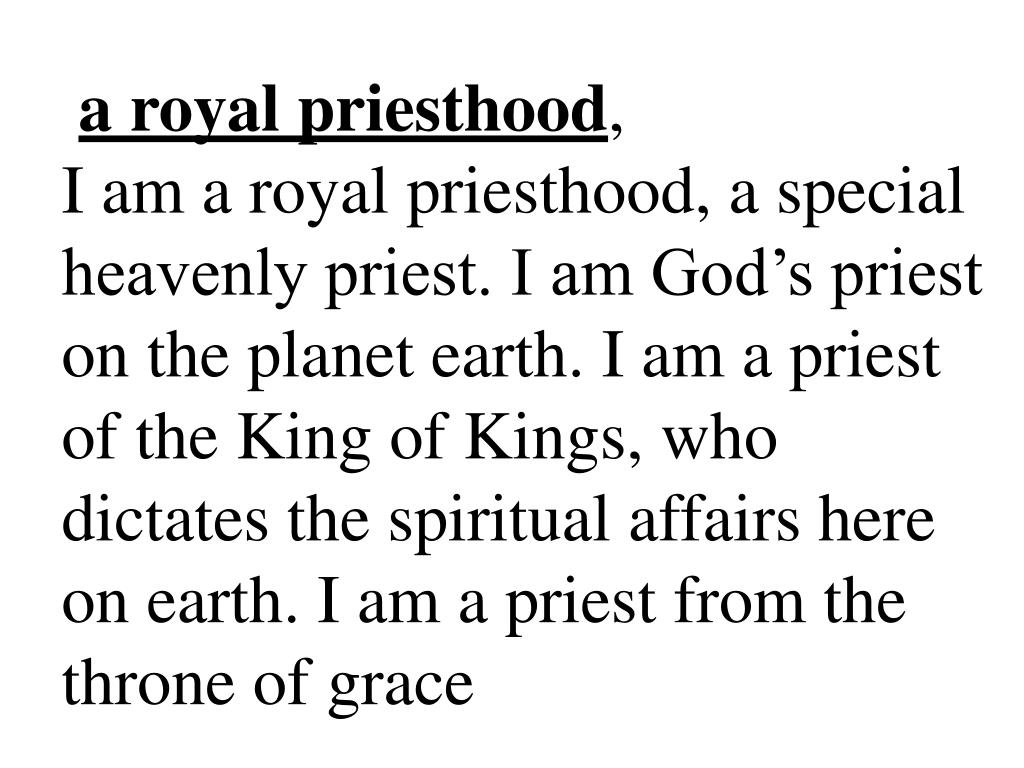 a royal priesthood, I am a royal priesthood, a special heavenly priest. I am God’s priest on the planet earth. I am a priest of the King of Kings, who dictates the spiritual affairs here on earth. I am a priest from the throne of grace