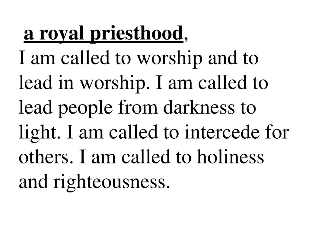 a royal priesthood, I am called to worship and to lead in worship. I am called to lead people from darkness to light. I am called to intercede for others. I am called to holiness and righteousness.