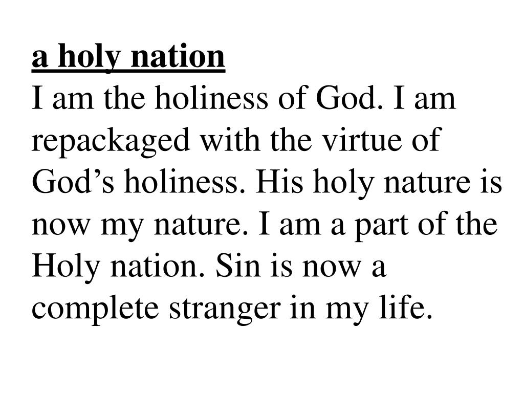 a holy nation I am the holiness of God. I am repackaged with the virtue of God’s holiness. His holy nature is now my nature. I am a part of the Holy nation. Sin is now a complete stranger in my life.