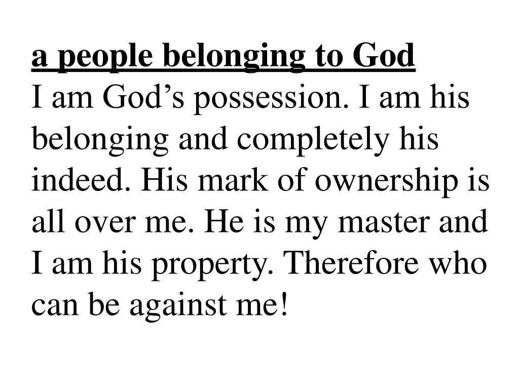 a people belonging to God I am God’s possession. I am his belonging and completely his indeed. His mark of ownership is all over me. He is my master and I am his property. Therefore who can be against me!