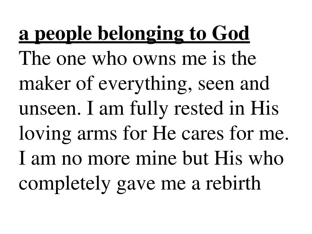 a people belonging to God The one who owns me is the maker of everything, seen and unseen. I am fully rested in His loving arms for He cares for me. I am no more mine but His who completely gave me a rebirth