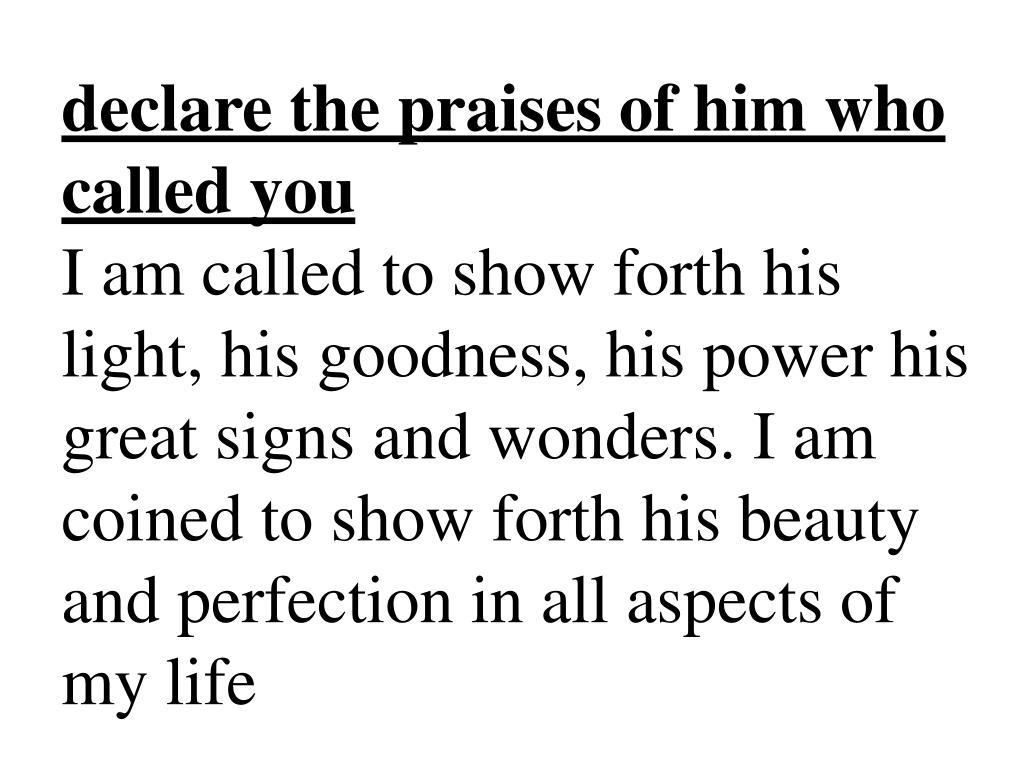 declare the praises of him who called you I am called to show forth his light, his goodness, his power his great signs and wonders. I am coined to show forth his beauty and perfection in all aspects of my life