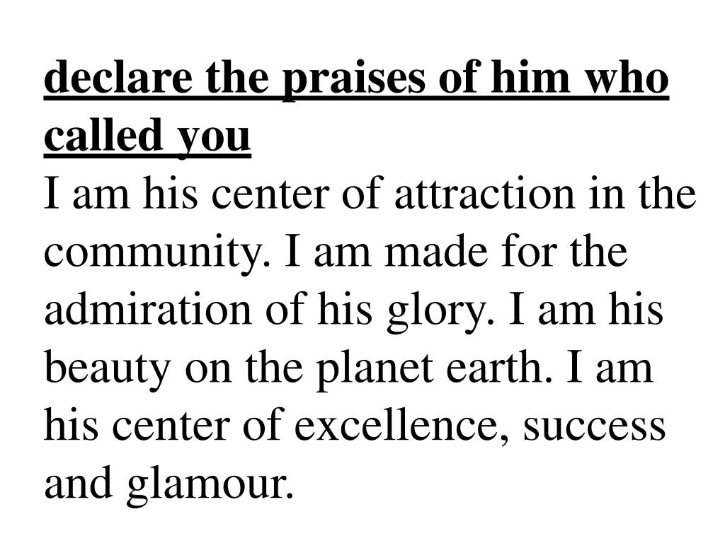 declare the praises of him who called you I am his center of attraction in the community. I am made for the admiration of his glory. I am his beauty on the planet earth. I am his center of excellence, success and glamour.