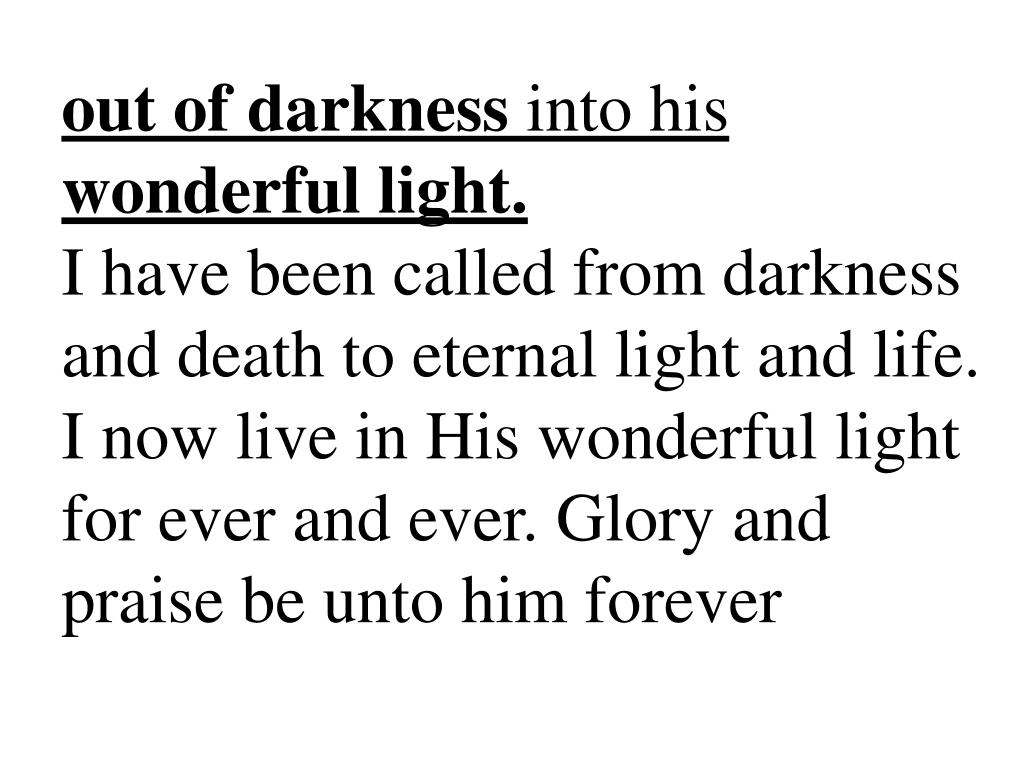 out of darkness into his wonderful light. I have been called from darkness and death to eternal light and life. I now live in His wonderful light for ever and ever. Glory and praise be unto him forever
